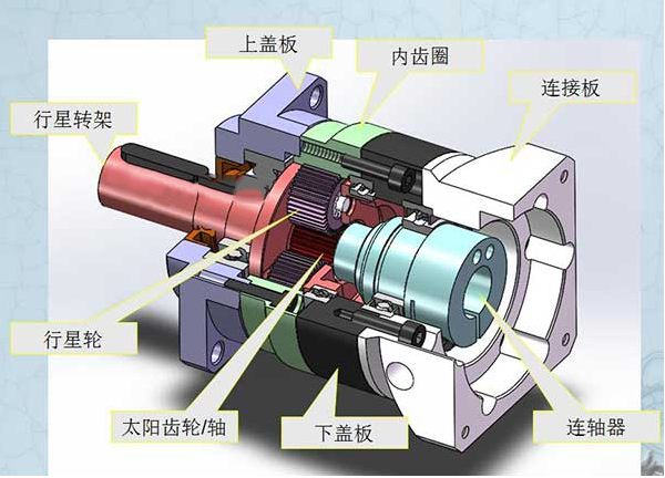 行星減速機的基本傳動結構分為太陽齒輪、行星齒輪、內齒輪環、連...